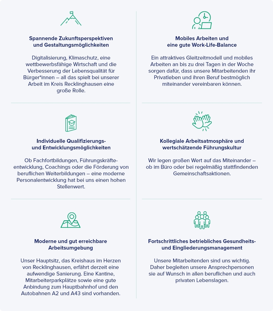 Als Arbeitgeber stehen wir im spürbaren Wettbewerb um gute Leute: Wettbewerb um Talente, die wir für die Kreisverwaltung Recklinghausen gewinnen wollen und müssen. Wettbewerb um unsere bestehenden Mitarbeitenden. Auf dieser Seite möchten wir einige zentrale Vorteile einer Mitarbeit beim Kreis benennen – und gleichzeitig Schwerpunktthemen vorstellen, die uns dabei ganz besonders wichtig sind:
