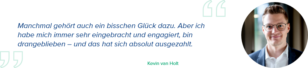 Heute leitet Kevin die Kreiskasse und ist in dieser Funktion für den gesamten Geldfluss und die Einbringung noch offener Forderungen der Kreisverwaltung verantwortlich. Außerdem fallen Anlagenmanagement und Fördermittel-Controlling in seinen Fachdienst. Für ihn haben sich Eigeninitiative und Ausdauer beruflich ausgezahlt. Auch sein Ausblick fällt positiv aus: Durch stete Modernisierung – nicht zuletzt im Zuge der Kreishaus-Sanierung – sieht sich Kevin auch für die kommenden Jahre in einem dynamischen Arbeitsumfeld, in das er sich voll einbringen kann.